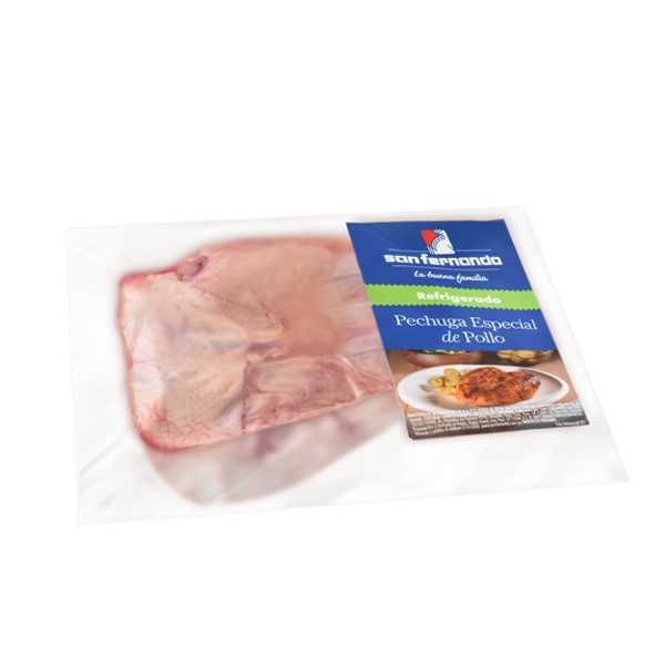 Corte de la parte frontal de la pechuga de pollo, empacada al vacio y refrigerada.